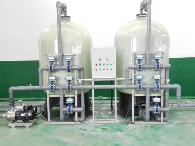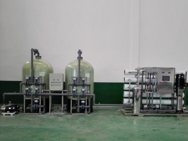 源水箱→源水增壓泵→多介質過濾器→活性碳過濾器→陽樹脂軟化器→精密過濾器→一級RO反滲透純水系統→純水水箱→增壓泵→用水點